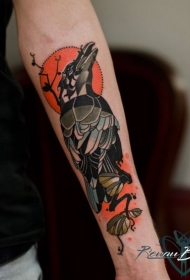 手臂新传统风格的彩色猫头鹰与玫瑰纹身