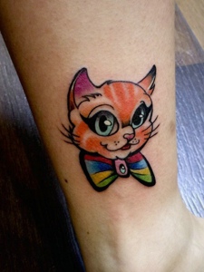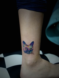 小腿部的一只彩色小花猫纹身图片