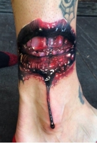腿部彩色恐怖血腥的嘴巴纹身图案