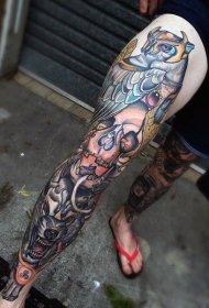 小腿逼真的彩色巫师与狼和燃烧教会纹身图案