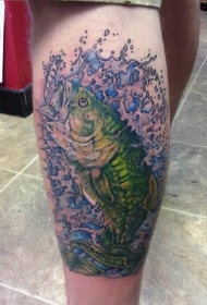 小腿绿色的鲤鱼和浪花纹身图案