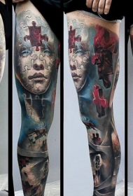 腿部五彩拼图人物肖像纹身图案