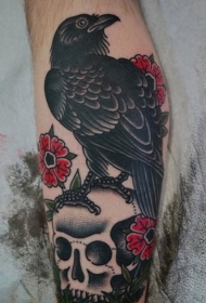 old school五彩斑斓的骷髅乌鸦花朵小腿纹身图案
