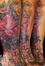 小腿写实风格美丽的女人与玫瑰和骷髅纹身图案