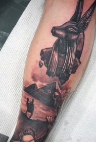 小腿埃及主题黑灰金字塔和雕像纹身图案