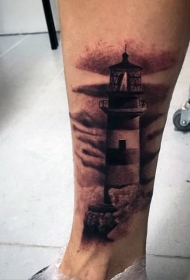小腿雕刻风格黑色灯塔和浪花纹身图案