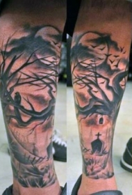 小腿令人毛骨悚然的黑色恶魔墓地乌鸦纹身图案