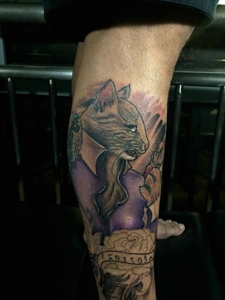 小腿看似很惊讶的小花猫头像纹身