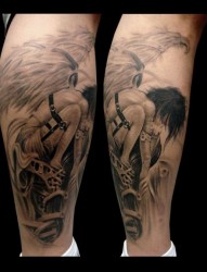 小腿处一直水墨柴犬与水中自己的影子纹身图片