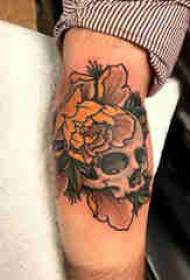 植物纹身 女生小腿上骷髅和花朵纹身图片