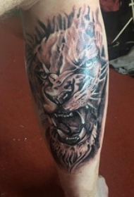 男生小腿上黑灰素描点刺技巧创意霸气豹子头纹身图片