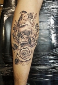 男生小腿上黑灰点刺简单线条植物花朵和骷髅纹身图片
