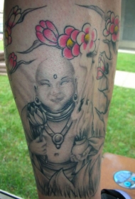 小腿彩色甲虫轮廓与鲜花纹身图案