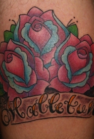 腿部彩色三朵玫瑰字母纹身图案