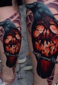 腿部彩色乌鸦与燃烧头骨纹身图案