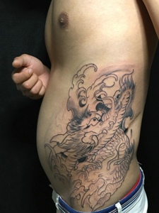 还未完成的侧腰部邪龙纹身图案