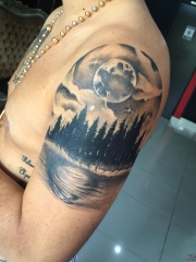 男生手臂上黑色简单线条星空元素手弹吉他纹身图片