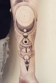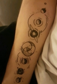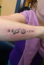 女生手臂上黑色点刺几何线条星球纹身图片