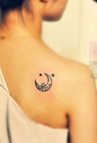 女生后背上黑色简约线条微型月亮与星星清新纹身图片