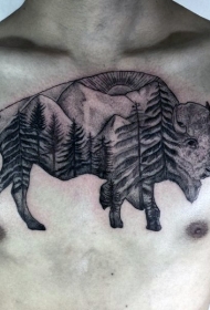 胸部黑灰牦牛与山林风景纹身图案