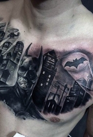 胸部黑色令人难以置信的蝙蝠侠与城市纹身图案