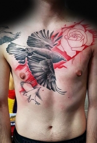 胸部彩色玫瑰与黑乌鸦纹身图案