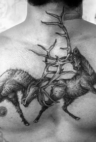 雕刻风格黑色打架的鹿纹身图案