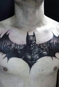 胸部华丽的黑色蝙蝠侠与徽章纹身图案