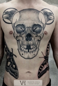 胸部经典的黑色人类骷髅与乌鸦纹身图案