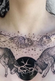 胸部雕刻风格黑色战斗鹿和山脉纹身图案
