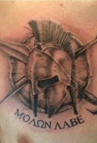 胸部黑色斯巴达头盔与交叉武器纹身图案