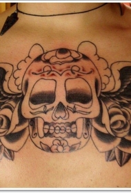 黑灰墨西哥骷髅与玫瑰胸部纹身图案