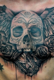 胸部黑灰翅膀骷髅玫瑰和时钟纹身图案