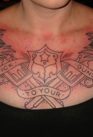女孩胸部黑色手枪和玫瑰纹身图案