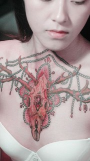 美女霸气骷髅鹿头胸前纹身