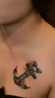 女生彩色个性船锚胸部纹身