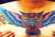 女生胸前时尚的彩色猫头鹰纹身