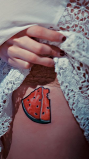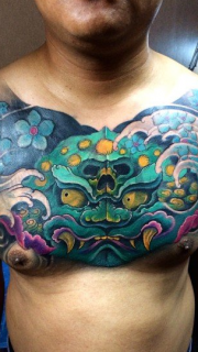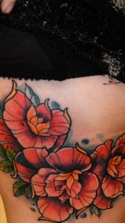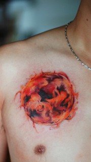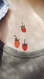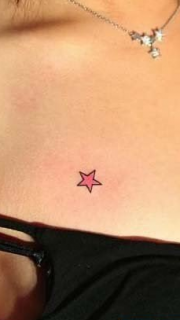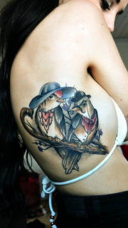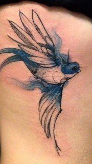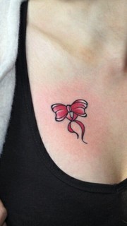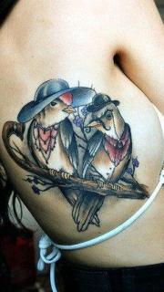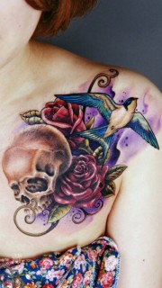 女生前胸时尚经典的骷髅玫瑰花与燕子纹身图案