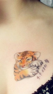 女生胸部彩色老虎可爱另类纹身