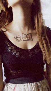女性胸前书和咖啡纹身