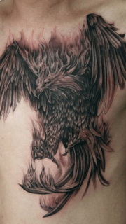 男人前胸超酷黑灰的朱雀纹身图案