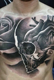 纹身胸部男 男生胸部玫瑰和骷髅纹身图片