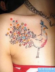 文身520图库推荐一幅彩色孔雀文身作品