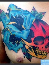 胸部个性彩色骷髅头玫瑰花纹身作品