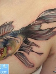 一幅胸部彩色金鱼纹身作品