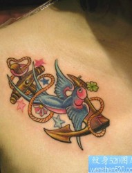 一幅彩色燕子船锚纹身作品