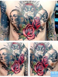 胸部纹身图片:潮流经典胸部彩色玫瑰纹身图片纹身作品