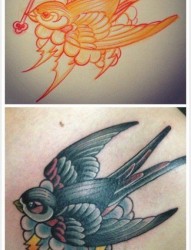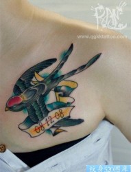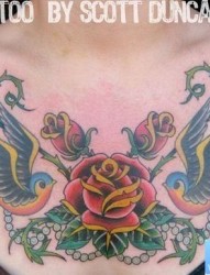 女人前胸时尚潮流的old school玫瑰花小燕子纹身图片