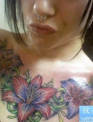 女人前胸潮流漂亮的百合花纹身图片