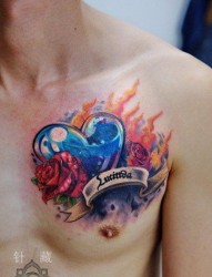 胸前经典很酷的彩色爱心玫瑰花纹身图片